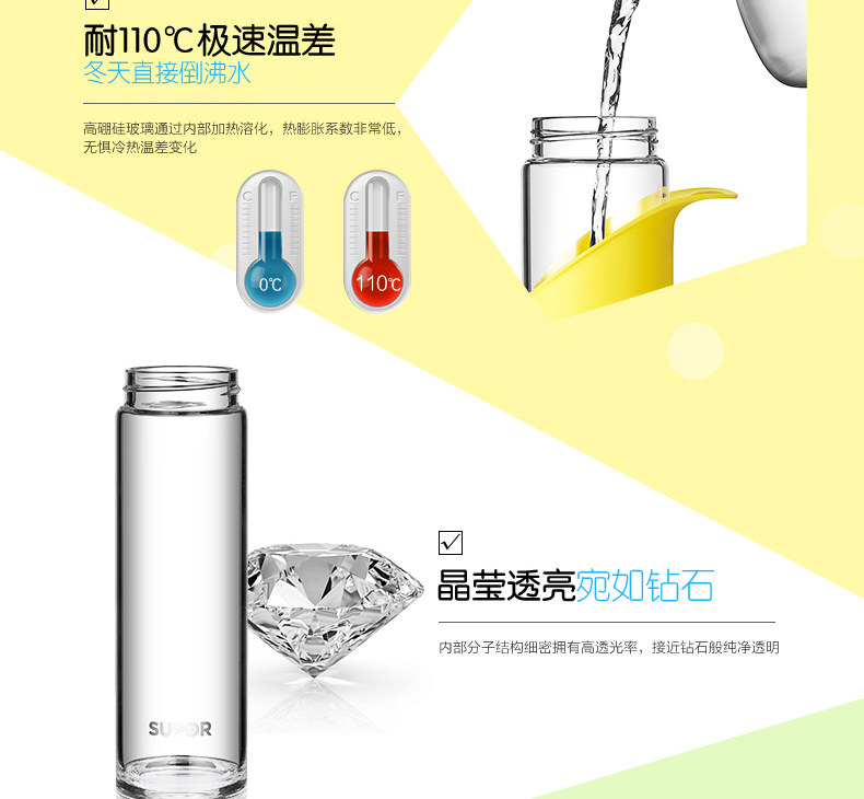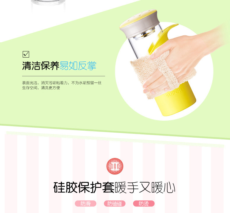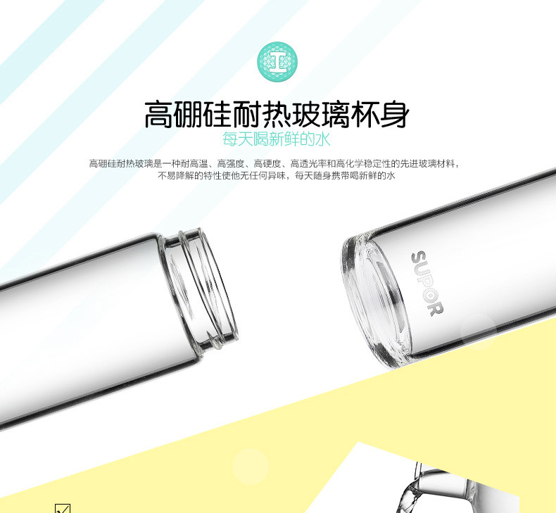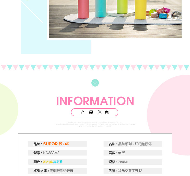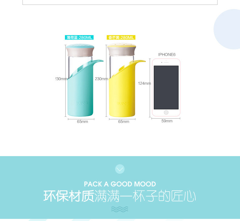 包装尺寸:191*191*206mm 装箱尺寸:615*415*240mm 装箱数量:24个 整箱毛重:10.10kg 净 重:7.20kg 容 量:280ml 单品毛重:0.42kg 净 重:0.30kg 材 质:高硼硅耐热玻璃 颜 色:香芒黄/薄荷蓝 保温性能:110℃高耐热