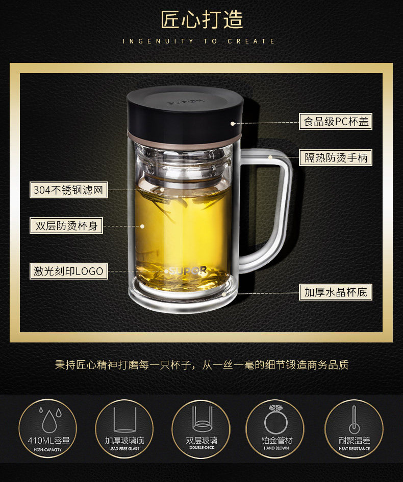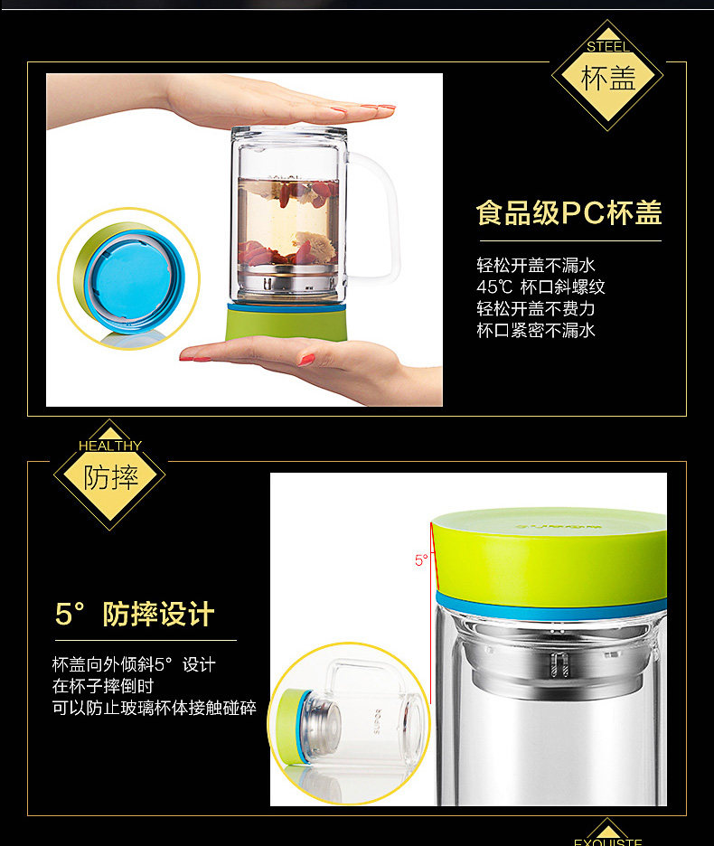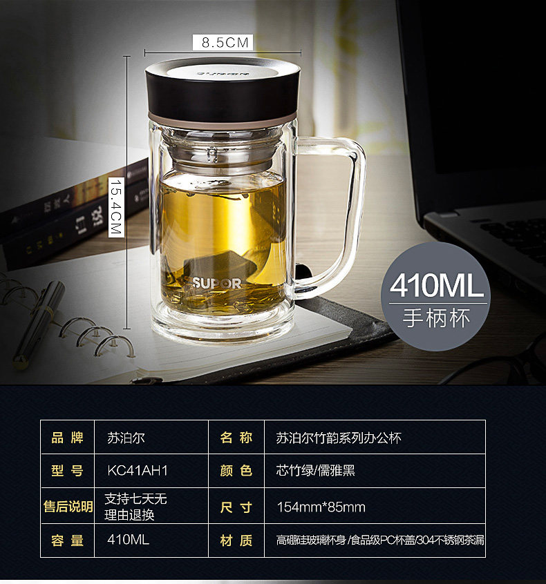 包装尺寸:370*284*190mm 装箱尺寸:605*395*425mm 装箱数量:24个 整箱毛重:13.99kg 净 重:12.0kg 容 量: 410ml 单品毛重:0.58kg 净 重:0.50kg 材 质:高硼硅耐热玻璃 颜 色:芯竹绿\儒雅黑 耐 温:-20度至120度 功 能:储水、泡茶