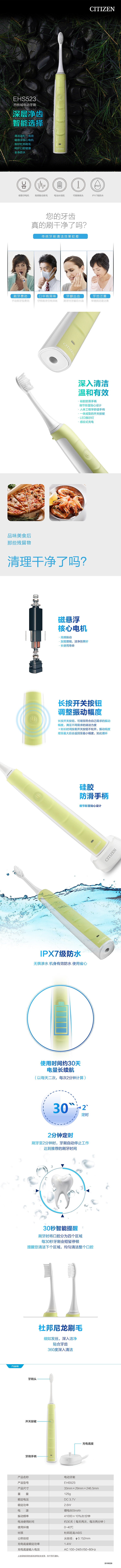 磁悬浮核心电机,高频震动刷毛 · 舒适刷牙体验;长使用寿命 · 2分钟定时,30秒智能提醒 · 电池充电时间:大于12小时 · 电量长续航,可使用30天 (每天二次,每次2分钟) · IPX7级防水,有效保护产品 · 感应式充电