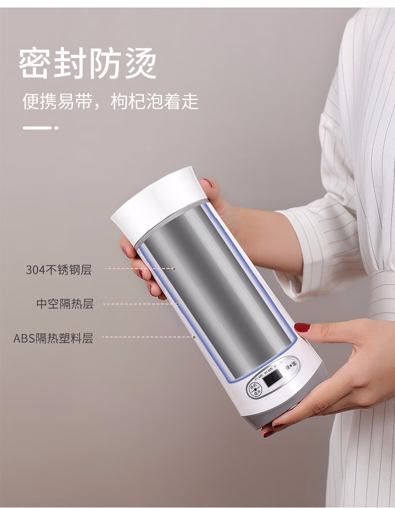 350ml容量,300W功率,304不锈钢内胆,旅行便携烧水杯。电脑款杯底可收纳电源线,可盖盖烧水,三段保温!